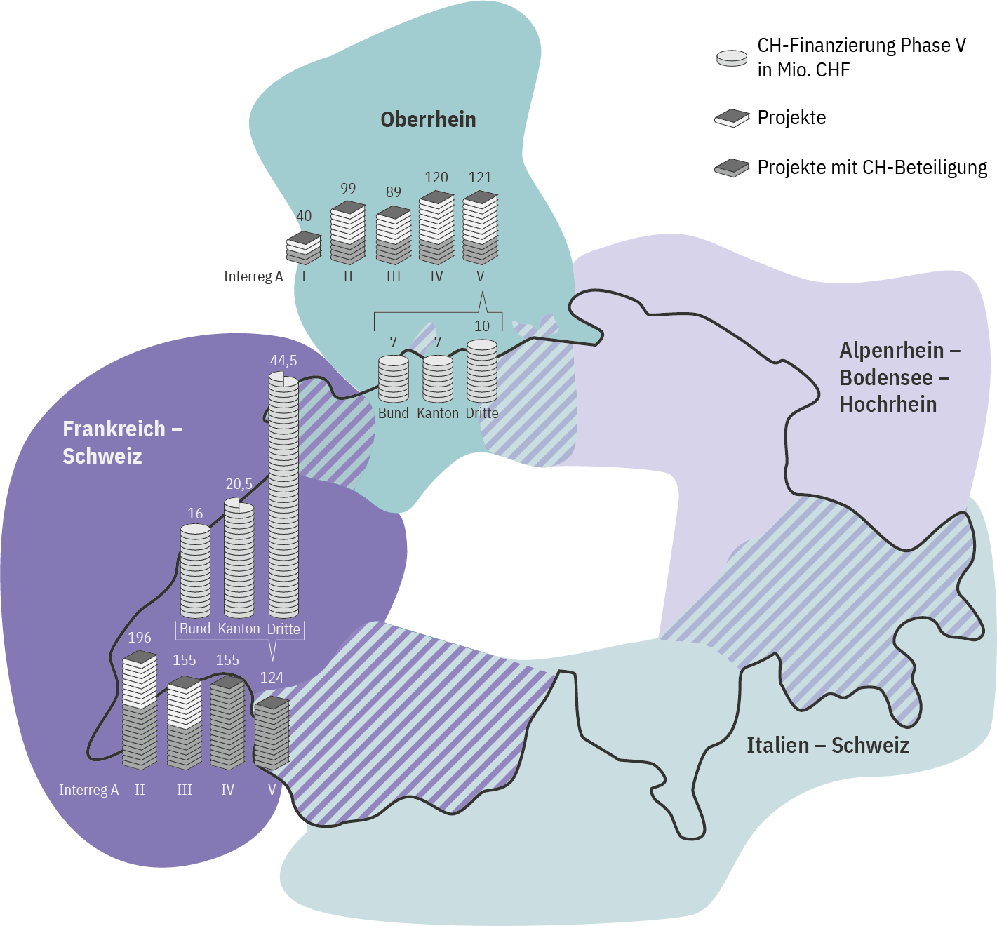 Der Bund hat über die Jahre sein finanzielles Engagement von 24 Millionen Franken für Interreg II auf 56 Millionen für Interreg VI (2021–2027) erhöht. Die Kantone leisten an die grenzüberschreitenden Programme mindestens gleich hohe Beiträge. Die Förderbeiträge von Bund und Kantonen lösen dabei erhebliche zusätzliche Investitionen Dritter aus, etwa von Gemeinden, Organisationen, Hochschulen oder Unternehmen.