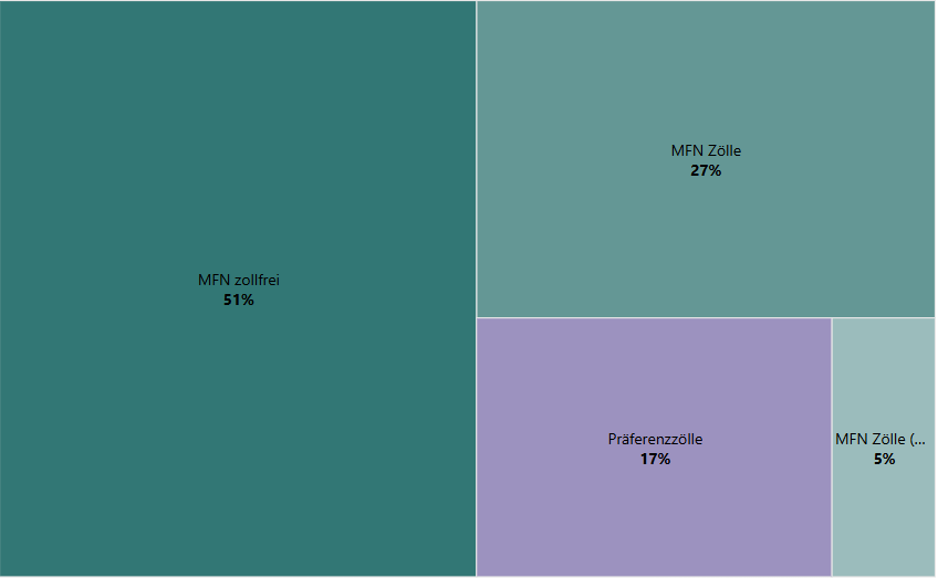 Bemerkenswert ist, dass 5 Prozent des zollpflichtigen MFN-Handels potenziell für Präferenzzölle etwa in Freihandelsabkommen infrage kamen, die Unternehmen sie aber nicht beanspruchten – etwa wegen komplexer Ursprungsregeln oder hohen Verwaltungsaufwands.[5]
