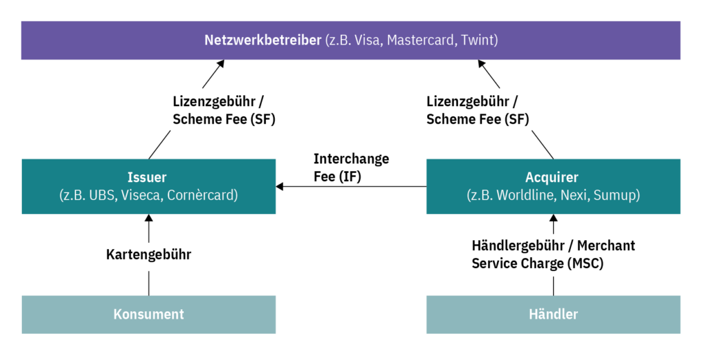 Innerhalb eines Mehrparteiensystems werden typischerweise drei unterschiedliche Gebührentypen erhoben (die Kartengebühr beträgt typischerweise null): die Händlergebühr (MSC) vom Händler an den Acquirer, die Interchange Fee (IF) vom Acquirer an den Issuer und die Scheme Fee (SF) vom Acquirer und vom Issuer an den Netzwerkbetreiber. Die Struktur und die Höhe dieser Gebühren sind ausdifferenziert. So sind beispielsweise Gebühren für Zahlungen mit ausländischen Karten häufig höher als für jene mit inländischen, für Onlinezahlungen höher als für Zahlungen am Bezahlterminal, und bei Zahlungen von Gütern des täglichen Bedarfs kommt teilweise ein reduzierter Gebührensatz zur Anwendung. Zudem wird die MSC von der Bank des Händlers individuell für die einzelnen Händler festgelegt und dürfte für grössere Händler mit vielen Zahlungsabwicklungen wesentlich tiefer sein als für kleine. Wie hoch die MSC tatsächlich sind, kann deshalb nicht gesagt werden. Die Gebühren für kleinere Händler dürften aber ungefähr 1 bis 2 Prozent des Verkaufspreises bei Debitkarten und Twint und 1,5 bis 2,5 Prozent des Verkaufspreises bei Kreditkarten ausmachen.[2]
