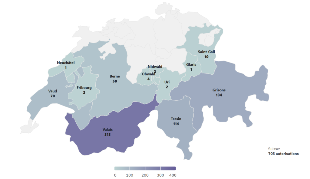 En 2023, les personnes à l’étranger ont acquis moins de logements de vacances en Suisse que l’année précédente. Au total, les cantons ont délivré 703 autorisations (contre 1020 en 2022) et 378 objets ont changé de main. Le Valais figure en tête des cantons touristiques avec 313 autorisations délivrées, suivi des cantons des Grisons, du Tessin, de Vaud et de Berne (voir illustration). Seulement 47% du contingent disponible, soit 1500 unités, ont été utilisés pour l’ensemble de la Suisse.